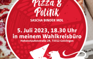 Direkte Gespräche über Politik und junge Themen: Das erwartet die Gäste bei „Pizza & Politik“ am Mittwoch, 5. Juli 2023, um 18.30 Uhr im Wahlkreisbüro des Geislinger Landtagsabgeordneten Sascha Binder (SPD). „Ihr bringt die Themen, ich die Pizza“, so Binder zu seiner Einladung an alle interessierten Jugendlichen. Neben spannenden Gesprächen in lockerer Atmosphäre erwartet die Gäste auch leckere Pizza, kühle [...]